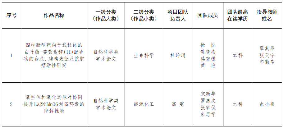 根据第十八届“挑战杯”全国大学生课外学术科技作品竞赛规则和评审要求,经学生团队申报、学校选拔、广西终审决赛评委会评审,我校拟推荐《四种新型靶向于线粒体的白叶藤-姜黄素锌(II)配合物的合成、结构表征及抗肿瘤活性研究》等2件作品参加第十八届“挑战杯”全国大学生课外学术科技作品竞赛,具体信息如下。