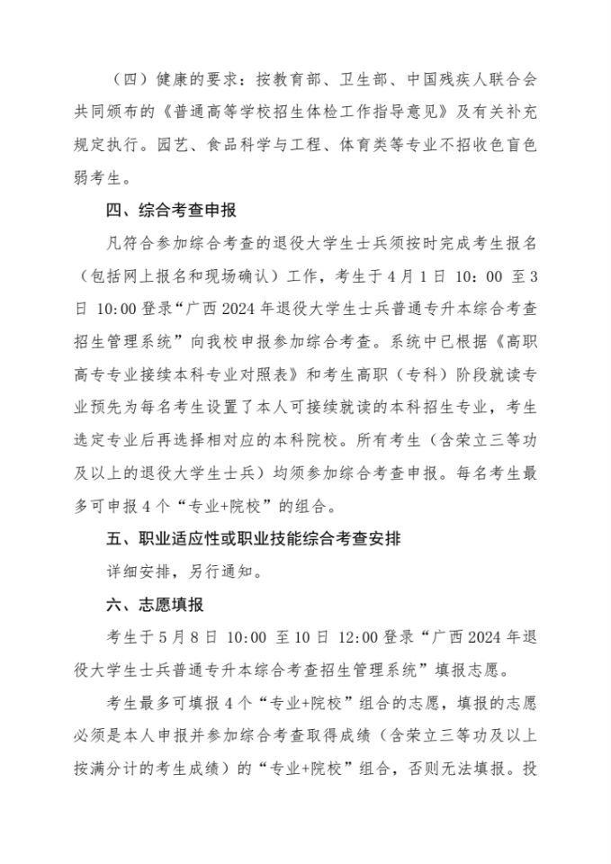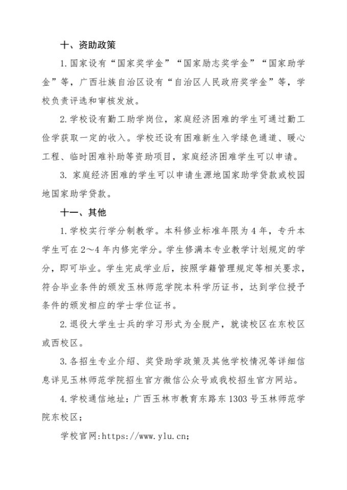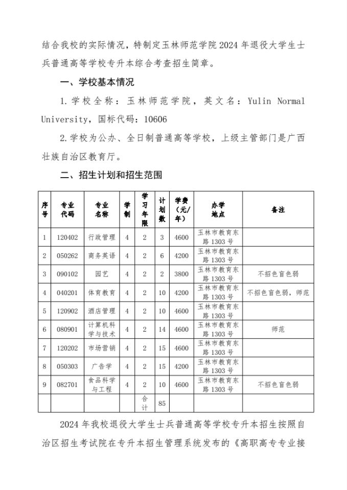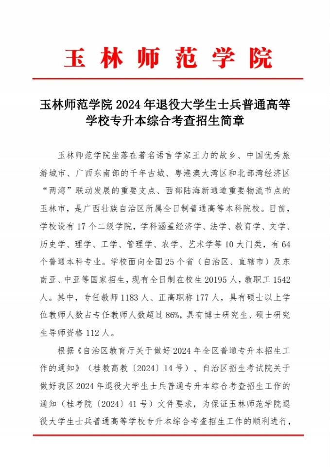 玉林师范学院2024年退役大学生士兵普通高等学校专升本综合考查招生简章