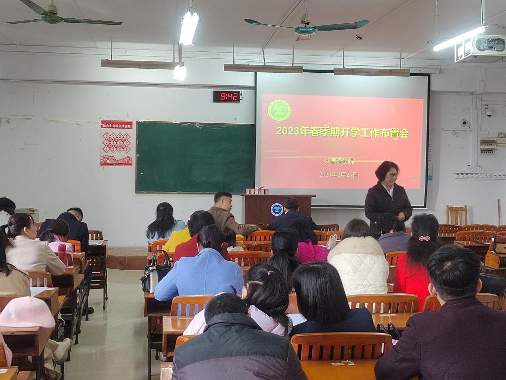 各分管副院长分别就2023年春季期各分管的工作进行规划布置。副院长郎晓娟布置了毕业生论文指导、英语专业评估、科研项目申报、学生考试以及教学工作等方面的安排。副院长熊惠从毕业生实践教学,网络资源的储备、英语竞赛和教学创新大赛等工作进行部署。