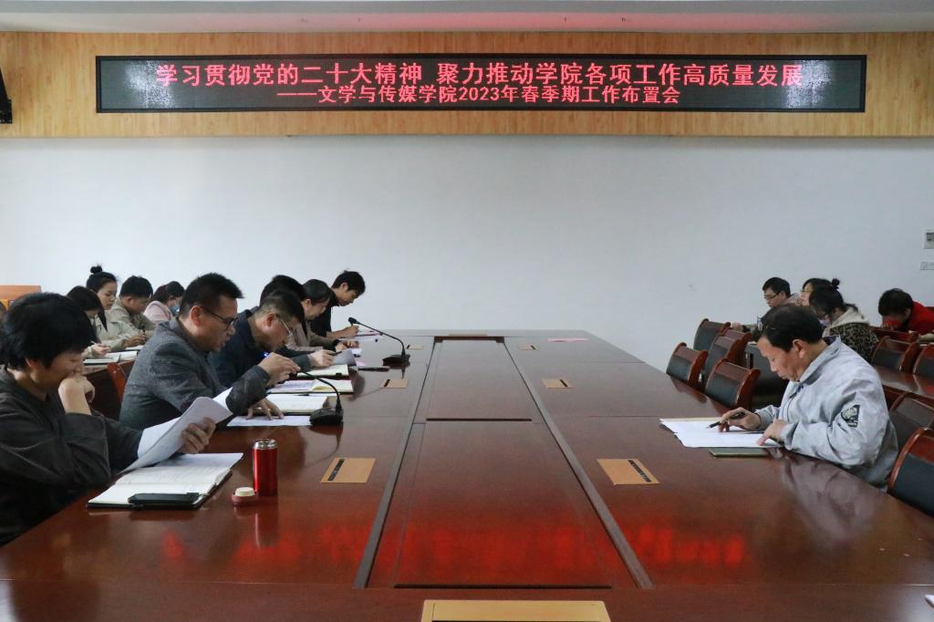 2月26日下午,文学与传媒学院于我校东校区至善楼309会议室召开“学习贯彻党的二十大精神·聚力推动学院各项工作高质量发展”2023年春季期开学工作布置会。学院党委书记邱冠,院长肖国栋,党委副书记梁丹,副院长郑立峰、胡瑜,以及全体教职工参加仪式。