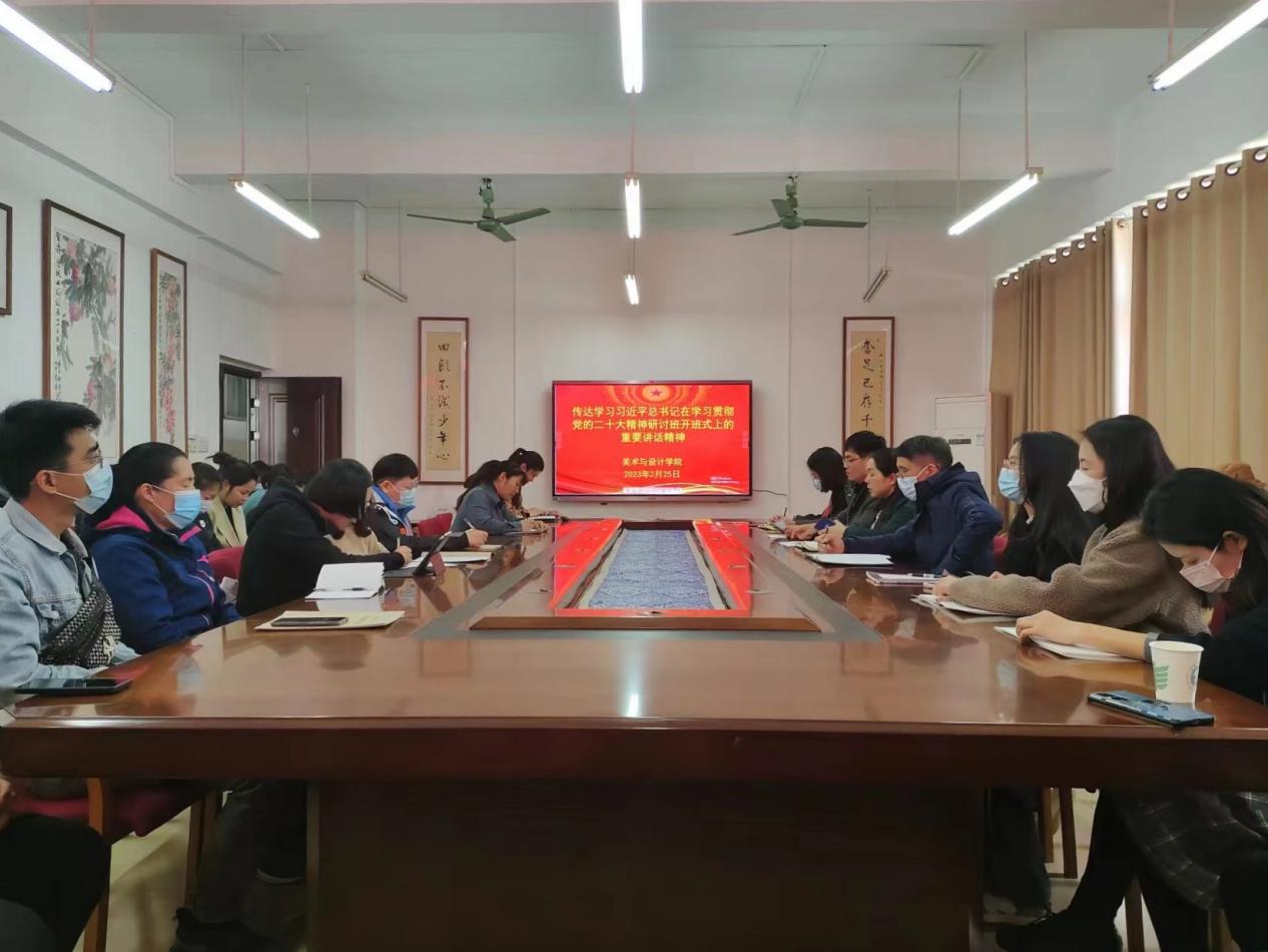 2月25日下午,美术与设计学院在我校东校区博学楼3-407会议室召开会议,该院党委书记黄培英带领全体教职工深入学习习近平总书记在学习贯彻党的二十大精神研讨班开班式上的重要讲话精神。