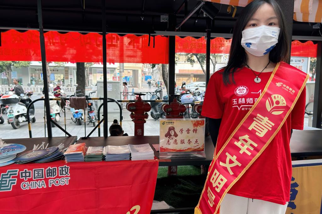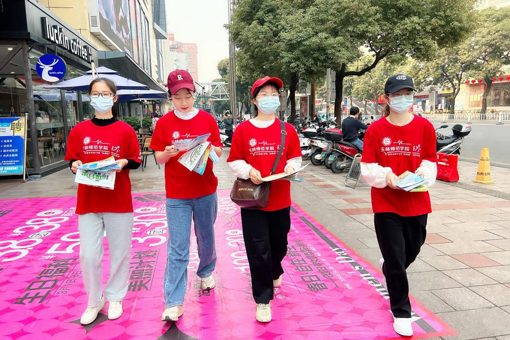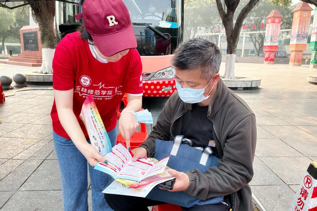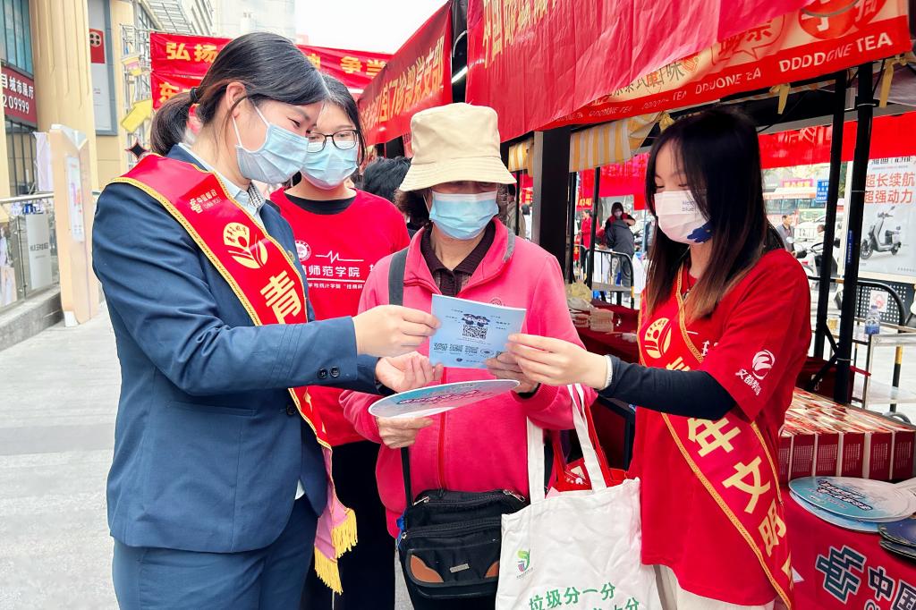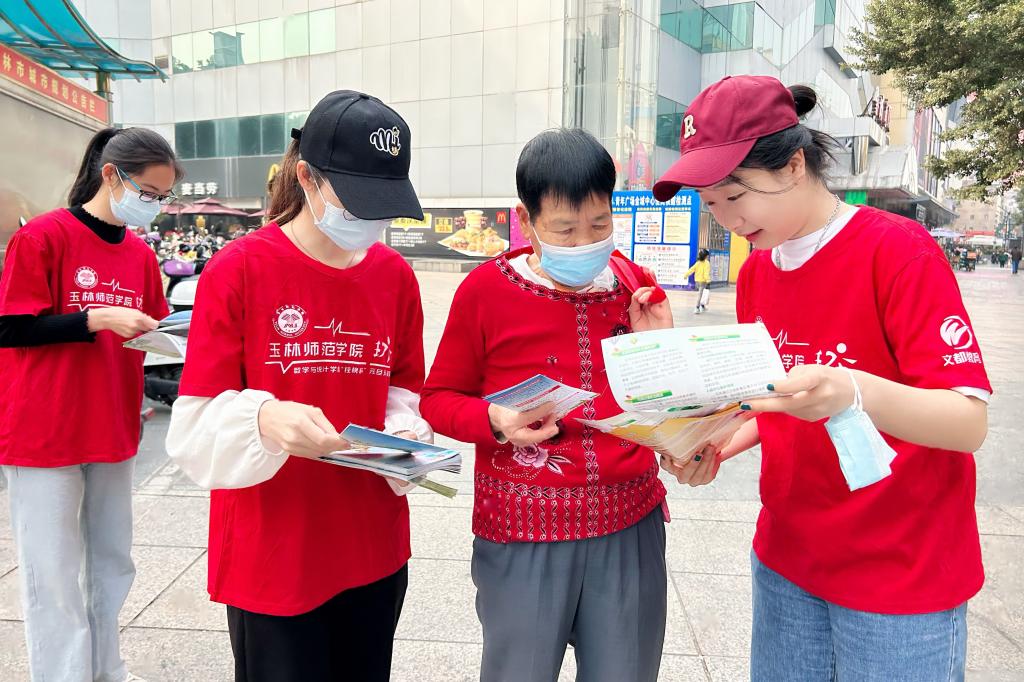 活动现场,大学生志愿者分成小组,积极参与到玉林市城市管理监督局、玉林市中心血站、玉州区人民检察院、中国邮政储蓄银行玉林市人民东路营业所等单位政策和法律法规宣传工作队伍中,他们踊跃在青年广场、城区街道、商场内,面向晨练的爷爷奶奶、行人、商贩、青少年等人群,采取“短平快”“接地气”的形式,突出宣传党的二十大精神、《妇女权益保障法》、防电信诈骗及断卡行动、安全生产、禁毒、控辍保学、应急安全、垃圾分类、法律服务、公益献血等内容。