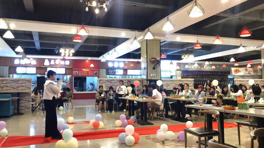 当天晚上7点,食堂二楼为女生们举办生日晚会。在现场大家共切蛋糕,由组织员工带头共同唱起了生日歌。接下来由女生们上台现场才艺表演,参与各种创意非凡的小游戏。最后每个参与者都抽取了一份小礼品盲盒。热闹的场面吸引了诸多同学们参与其中,食堂二楼欢声笑语不断。