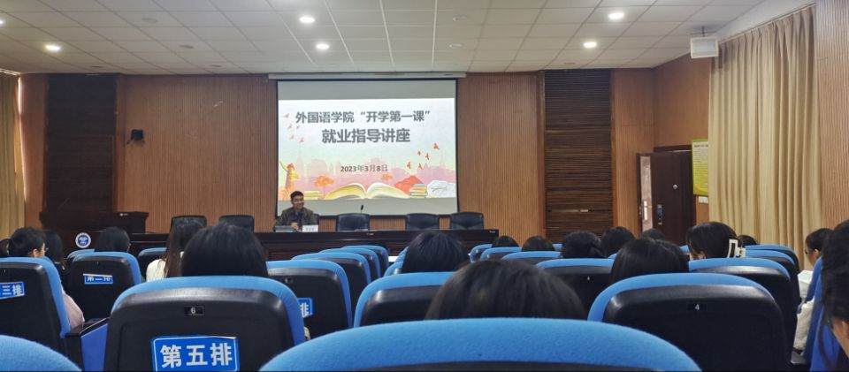 为做好外国语学院就业指导工作,培养学生的就业意识,提升就业能力,3月8日,该院在东校区博士论坛开展了“开学第一课”就业指导讲座。该院党委书记梁国初做主讲人,就业指导老师覃钰梅以及大四所有在校生参加讲座。