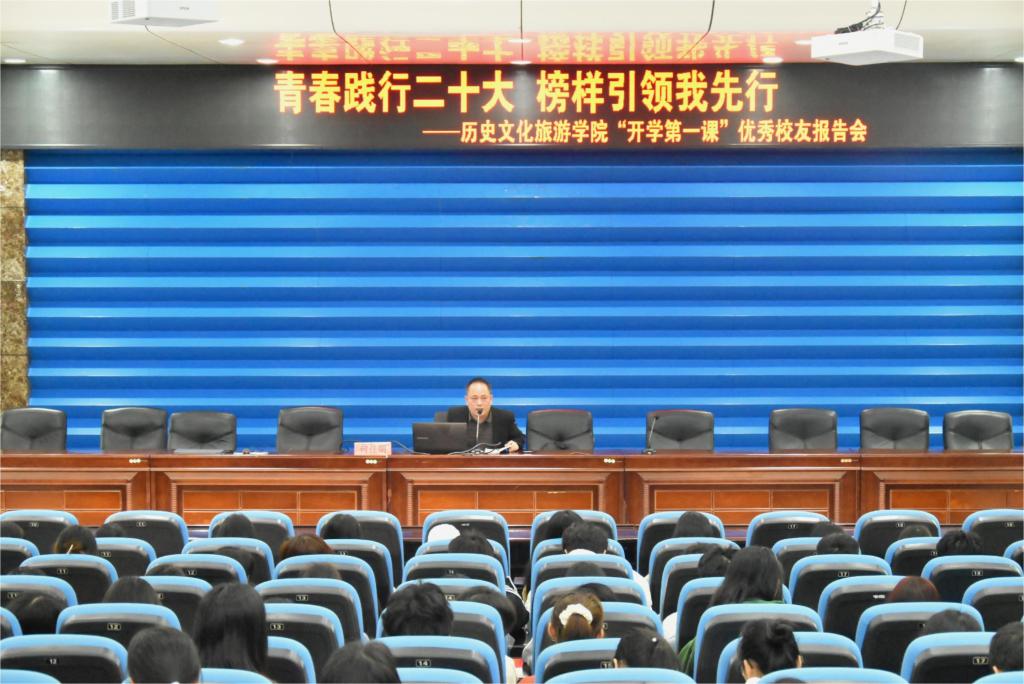 汲取榜样力量,砥砺奋进前行。 4月1日上午,历史文化旅游学院在我校东校区学术报告厅召开“青春践行二十大,榜样引领我先行——‘开学第一课’优秀校友报告会”。