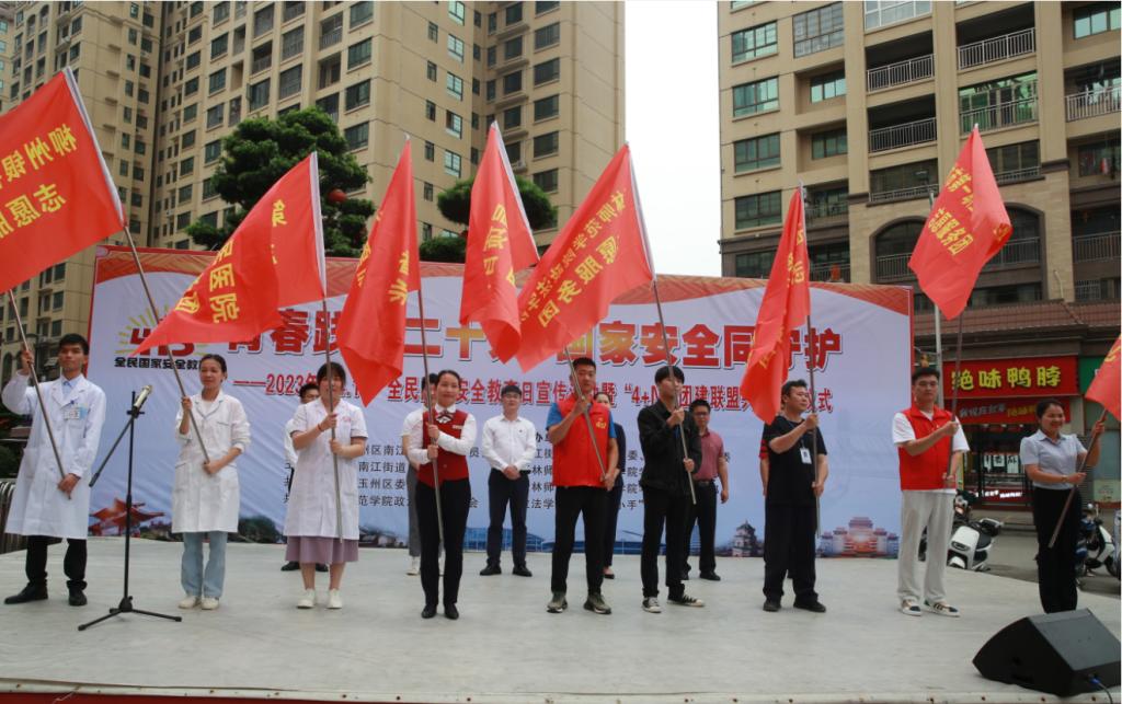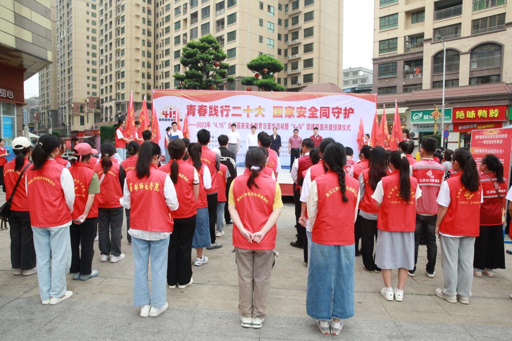 为深入学习贯彻党的二十大精神,弘扬爱国主义主旋律,牢固树立总体国家安全观在新时代国家安全工作中的指导地位,结合党旗领航群团联动,实现校地共建融合发展,资源共建共享。4月14日上午,政法学院联合玉州区江南街道办事处在玉州区南兴广场举行青春践行二十大·国家安全同守护——2023年“4.15”全民国家安全教育日暨“4+N”团建联盟共建授旗仪式。
