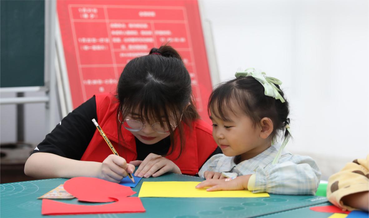 在手工剪纸环节中,志愿者边做边示范,一步步引导小朋友裁剪出小鸟的形状,其他志愿者则到小朋友身边进行手把手指导,锻炼小朋友们的动手能力。小朋友们在课堂上接受传统文化的熏陶,加深对传统文化的认同和喜爱。