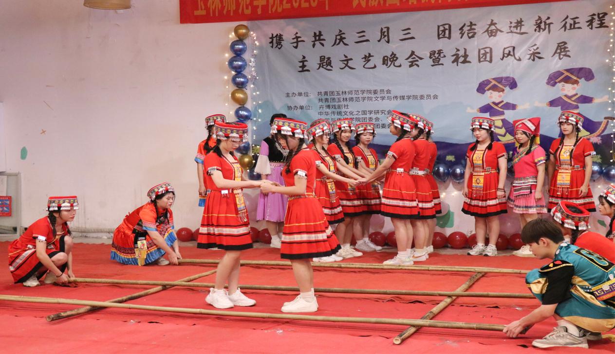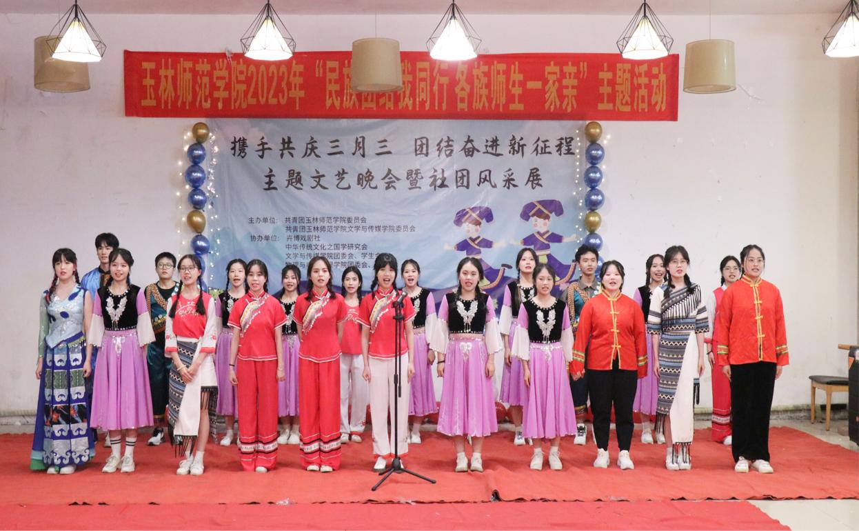 为贯彻落实党的二十大精神,继承和弘扬中华优秀传统文化,铸牢中华民族共同体意识,营造浓厚的壮族“三月三”节日氛围。我校于4月15日晚在东校区尚文阁食堂二楼举办“携手共庆三月三,团结奋进新征程”主题文艺晚会暨社团风采展。我校团委书记范良辰,团委副书记董积有以及文学与传媒学院党委副书记梁丹,团委书记,辅导员出席本次晚会。本次活动由学校团委、文学与传媒学院主办,卉博戏剧社、中华传统文化之国学研究会、物理与电信工程学院文工团承办。我校部分社团及各院学生代表参加。