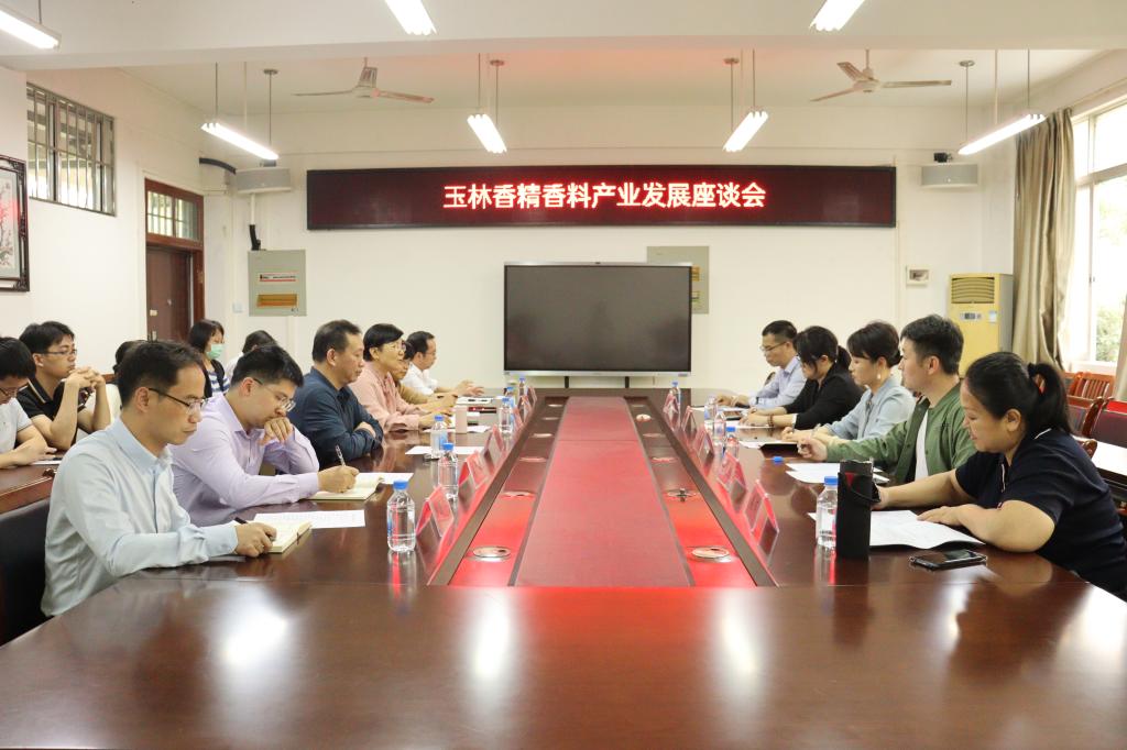4月14日,中华文化促进会香文化委员会主任张兰馨、清华大学未来实验室张文思博士、玉林市市场监督管理局总工莫萍等一行5人到我校东校区格物楼BA321会议室召开玉林香精香料产业发展座谈会。我校科研处处长石维有主持会议,化学与食品科学学院院长谭明雄、副院长陈渊等领导班子成员及生物与制药学院党委副书记蒋德旗参会。
