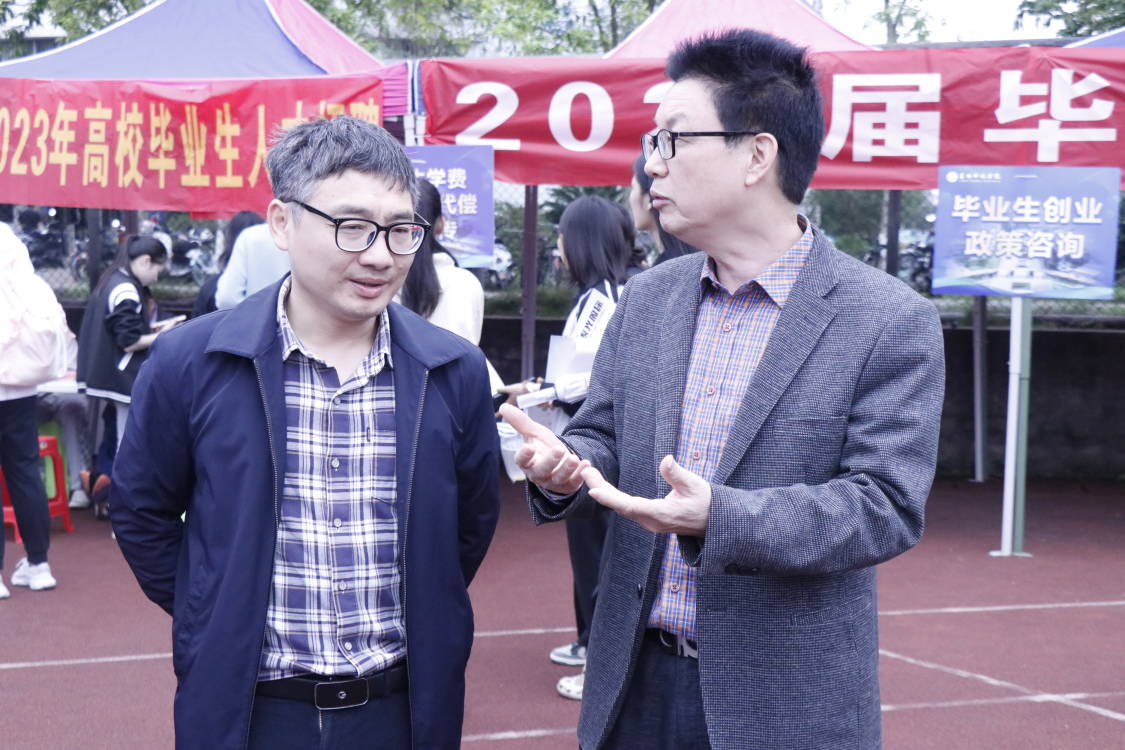 双选会期间,邱冠一行走访各用人单位,与现场招聘的用人单位深入洽谈,了解地方单位的用人需求,积极推荐学院毕业生就业。此外,邱冠还与现场求职的毕业生亲切交流,询问他们的求职意向,为他们提供就业指导建议并鼓励他们积极应聘、勇敢尝试、尽早就业。
