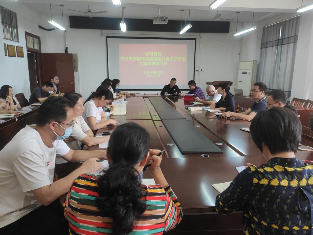 5月15日,生物与制药学院在我校东校区格物楼BA405会议室召开学习贯彻习近平新时代中国特色社会主义思想主题教育读书班集中学习。全体教工党员参与学习,该院党委书记李桂芬领学。