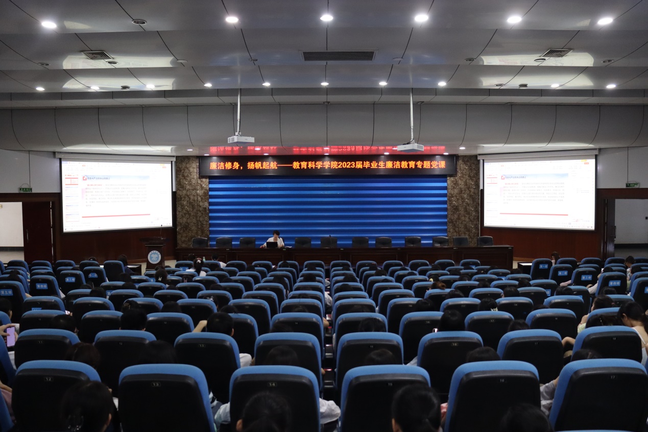 为扎实推进主题教育,进一步加强大学生廉洁教育,教育科学学院分别于5月31日、6月5日在东、西校区学术报告厅召开2023届毕业生廉洁教育专题党课,本次党课由该院党委副书记、纪委书记李尚芳主讲,全体毕业生参加。
