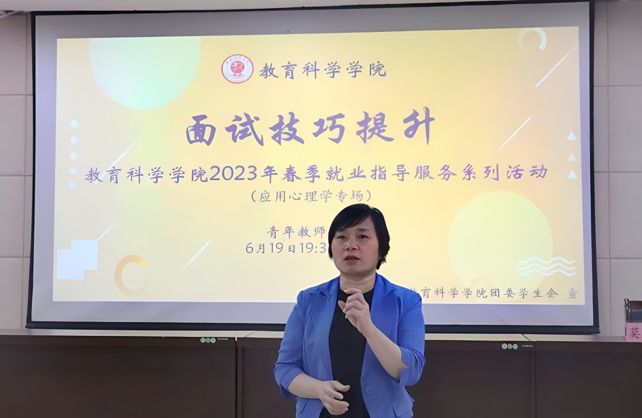 6月19日,教育科学学院在我校东校区育师楼406教室开展2023年春季就业指导服务系列活动之面试技巧提升应用心理学专场讲座。本次讲座特邀玉州区教育局教育研究室主任、正高级教师、特级教师张冬森和玉州区教研室心理健康教育教研员莫德姣主讲,讲座由学院党委副书记李尚芳主持,学院应用心理学专业学生参加此次讲座。