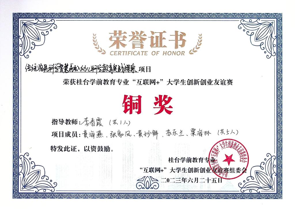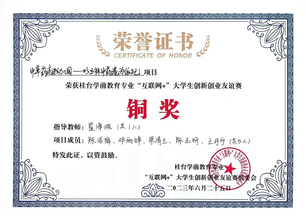 为学习贯彻党的二十大精神和习近平总书记关于对台工作的重要论述,不断巩固桂台教育交流合作常态化长效机制,深化桂台学前教育专业人才培养的交流与合作,提升两岸大学生创新创业能力,促进两岸大学生相互了解、增进友谊,自治区教育厅举办桂台学前教育专业“互联网+”大学生创新创业友谊赛。本次比赛由学院党委书记崔海波书记指导的《中草药走进幼儿园——以玉林中药港为依托》项目团队、由该院教师指导的《传统农具科学智慧融入幼儿园科学教育实践探索》项目团队荣获两项铜奖。