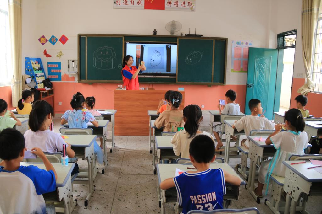 图为志愿者教同学们做折纸手工。