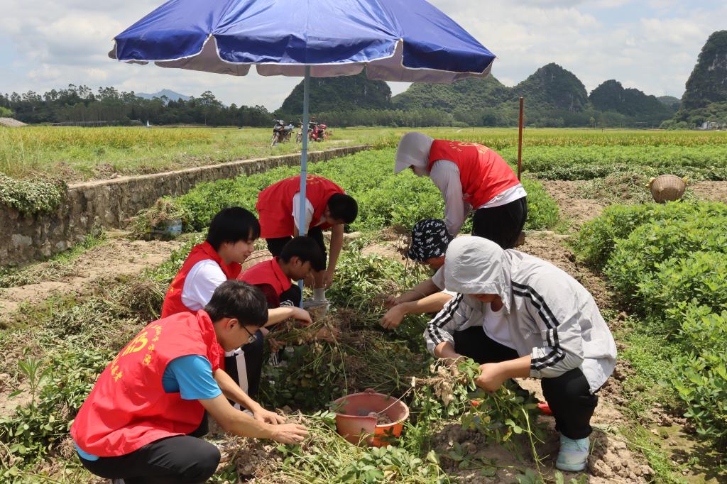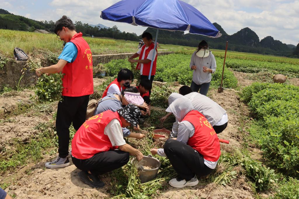 图为志愿者帮农户摘花生。
