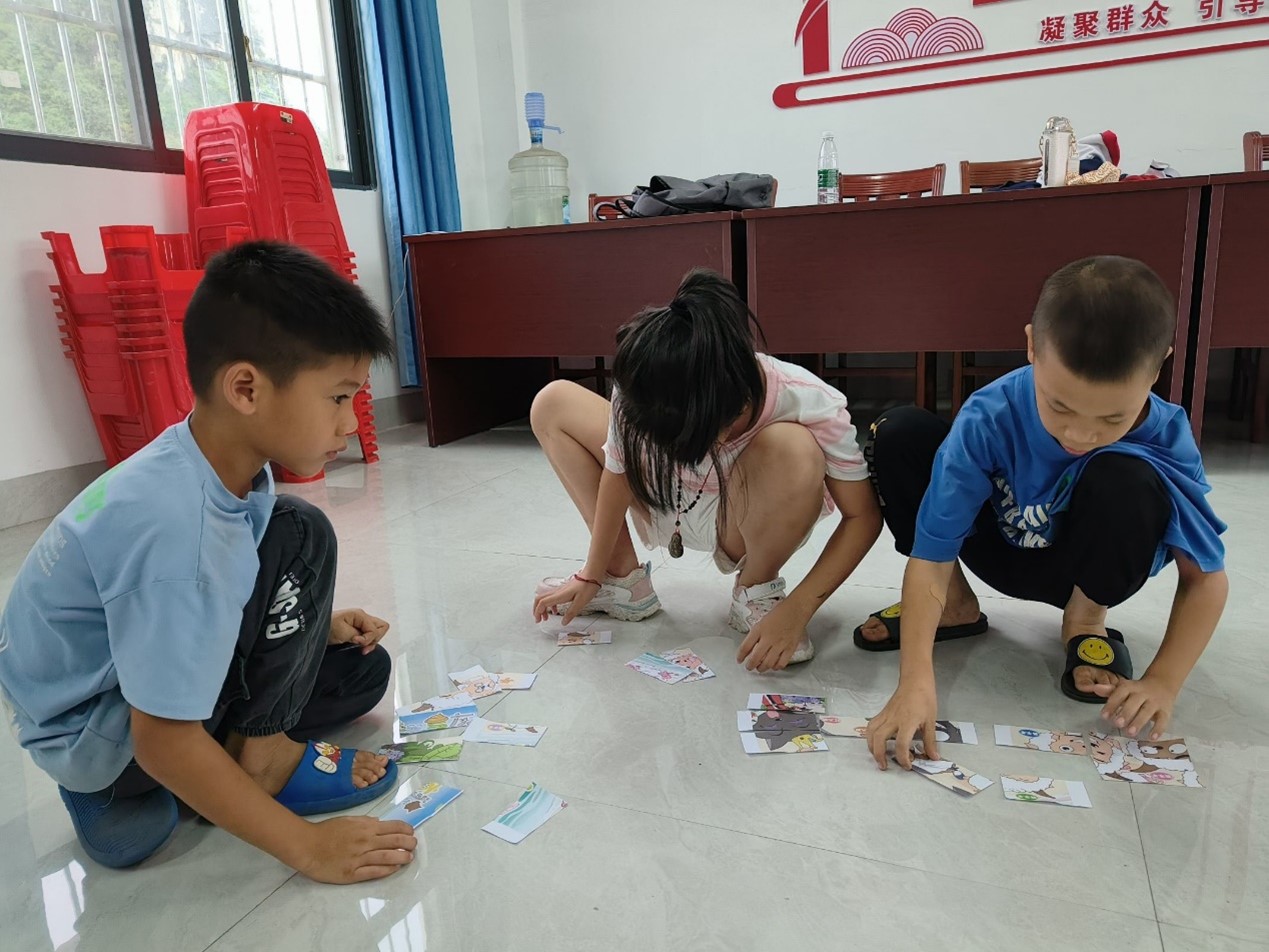 下午,为加强小学生们的合作意识,实践团开展“团结合作”为主题的心理健康团体辅导活动。活动包括“珠行万里”“你画我猜”“智慧拼图”,激发不同村屯边境小学生认识彼此、互助互进的意愿,为今后成长注入积极社会支持资源。