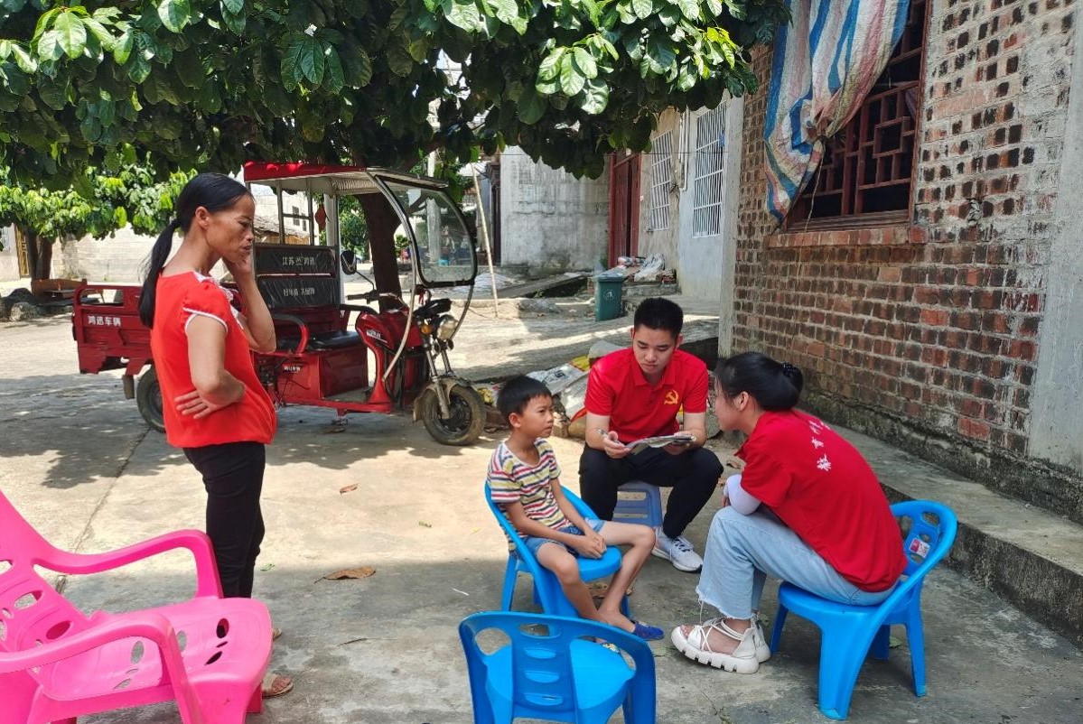 7月17日,在村干部和当地大学生志愿者的帮助下,实践团到洞埠村各屯对小学生及其家长进行访谈,聆听小学生成长故事,为后续活动开展做好准备。
