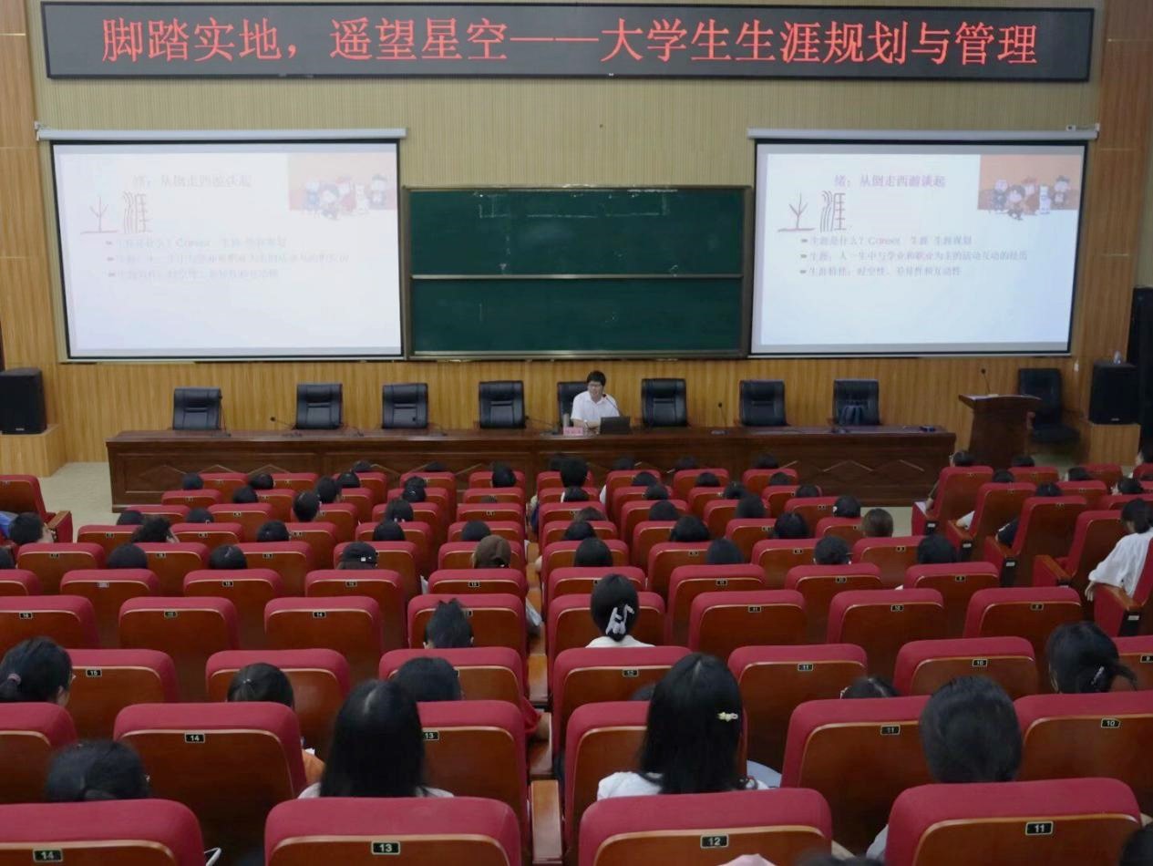 陈宛玉在我校东校区明德楼113教室为该院2023级全体新生讲授“脚踏实地,遥望星空——大学生生涯规划与管理”主题讲座。在讲座中,他围绕生涯的简约漫谈、生涯的一些内外认识和生涯希望的链接作用三个方面为学生展示大学生职业生涯规划的重要性和做法。他在讲到生涯的简约漫谈这一部分时,从倒走西游谈起,告诉学生进行生涯规划与管理的重要性,以及不远将来要面临的任务,从而引起新生对自己生涯事宜的思考。在讲生涯希望的链接作用中,他告诉学生在自己生涯希望的链接中,要保持积极期待、学会设定目标、善于找寻路径、掌握动因促进、不断反省调整。