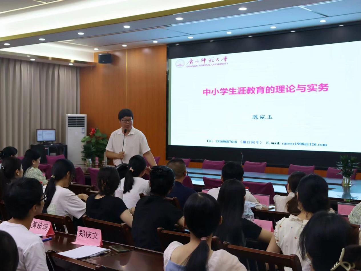 为帮助学生合理规划大学生活,引导学生树立正确人生观,培养求实创新精神,9月20号下午,广西师范大学教育学部教师陈宛玉博士受邀为教育科学学院师生、玉林市第一中学李昌凤工作坊坊员讲学。