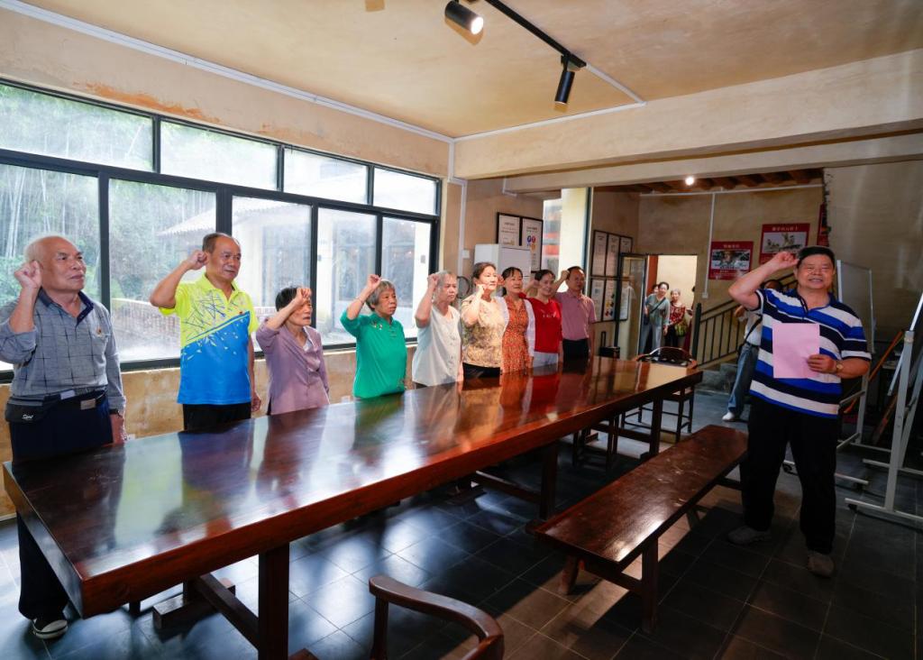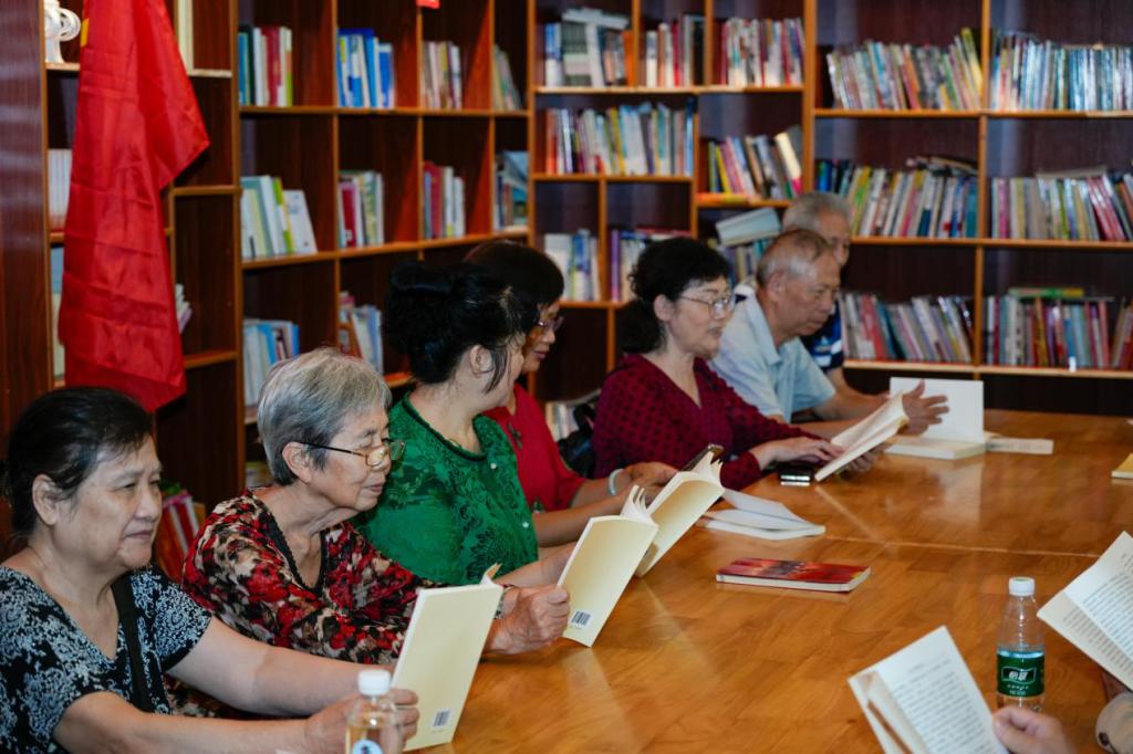 活动中,离退休党员同志在木棉书馆前合唱《没有共产党就没有新中国》《我们走在大路上》等红歌,以高亢嘹亮的歌声传达对党和国家的无比热爱。