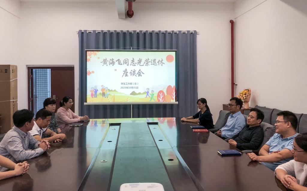 10月31日下午,学生工作部(处)于我校东校区新民楼D113会议室召开2023年退休教师荣休仪式,向光荣退休的教职工黄海飞老师表达敬意与祝福。学生工作部(处)全体人员参加座谈会。