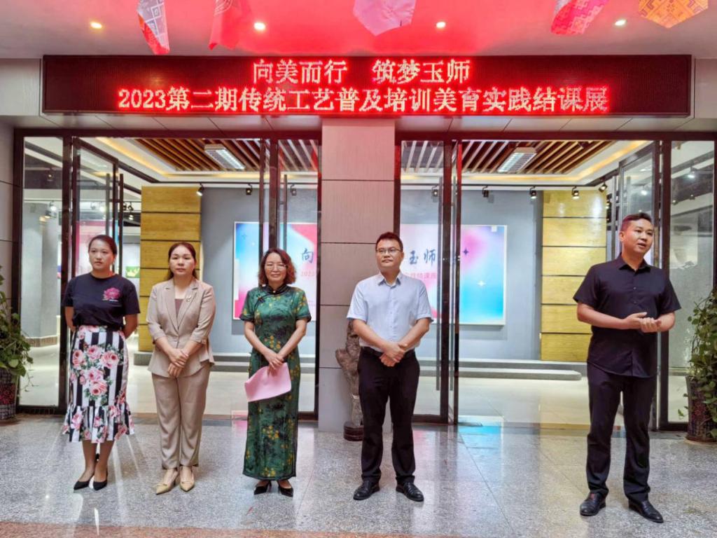 为弘扬中华民族传统文化,不断丰富拓展学校美育教育教学内容和形式,推进优秀传统文化进校园,11月1号上午,我校2023年第二期传统工艺普及培训美育实践结课展于东校区综合实训楼展厅开幕,学工处处长杨潇,教务处副处长王易萍,美育教育教学中心,美术与设计学院相关领导,包括13位留学生在内的本期全体学员103人以及该院学生代表参加开幕仪式。
