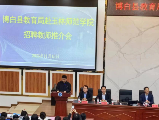 “去哪就业”不仅是生源地毕业生聚焦的关键话题,更是我校对毕业生的真实关切。为给2024届博白籍毕业生提供更精准的就业指导服务,11月15日晚上,博白县教育局于我校东校区新民楼D101多功能报告厅召开招聘教师推介会。招生就业处副处长欧斌、博白教育局副局长陈烽华及博白县各学校相关人员参会。