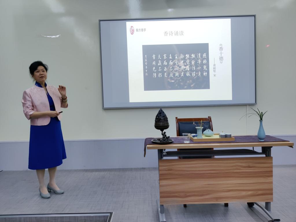活动现场,师宝萍将她带来的各类香材分发给在场的师生进行闻香,让他们用心感受不同香材。随后,在场人员在教师的带领下,体验篆香、燃香、闻香。在闻香的同时,教师带领学生诵读黄庭坚的诗《香十德》,悠悠香气,郎朗书声,在场人员都沉浸其中。
