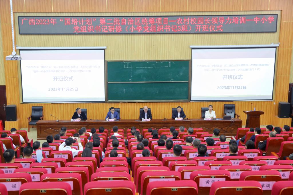 11月24日上午,我校于东校区明德楼113阶梯教室举行广西2023年“国培计划”第二批自治区统筹项目——农村校园长领导力培训——中小学党组织书记研修(小学党组织书记3班)培训班开班仪式。我校党委常委、副校长黄映然,政法学院党委书记陈一栋、院长周伟萌、党委副书记覃艳超、副院长袁名泽,培训管理团队全体教师及培训班全体学员参加开班仪式。开班仪式由袁名泽主持。