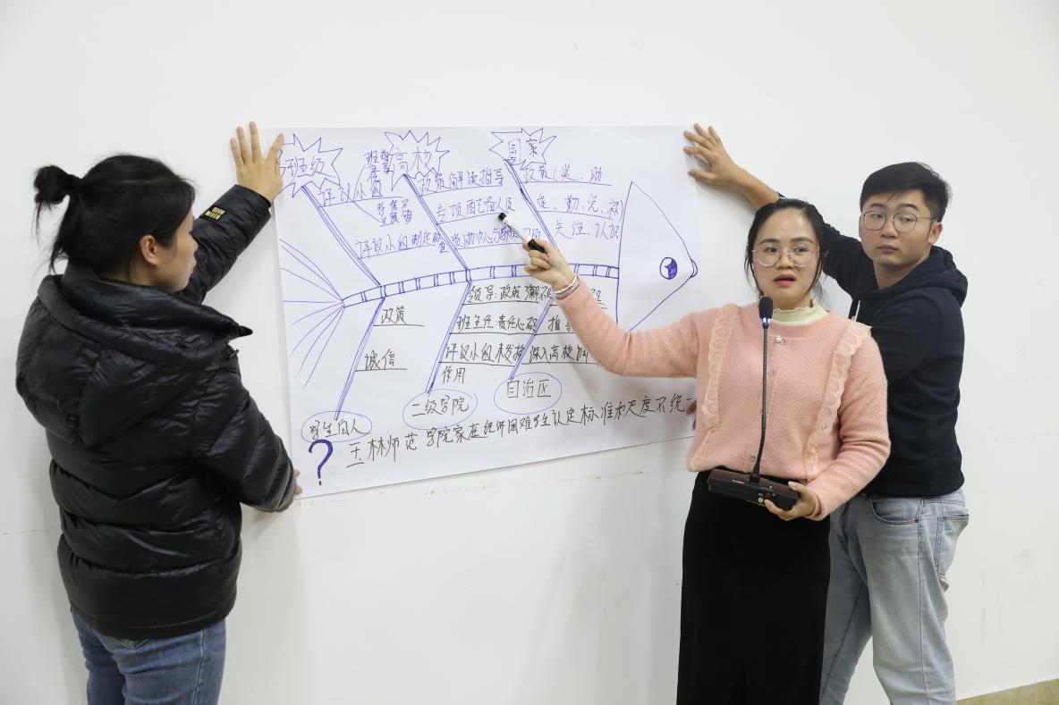 随后,学生资助管理中心剖析家庭经济困难学生认定工作中存在的问题。活动中,与会辅导员分为三组,围绕“大数据背景下的家庭经济困难学生认定研究”利用鱼骨分析法、头脑风暴法分析目前家庭经济困难学生认定工作所遇到的问题、及其原因与对策,并轮流上台阐述。