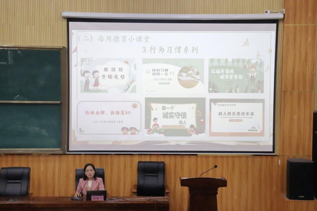 会上,邱春兰围绕大芦小学德育校本课程的实施与成果进行讲解。她讲述大芦小学实施德育校本课程的一系列工作措施,包括开设校长思政大讲堂、每周德育小课堂等,她表示,通过一系列举措不断加强小学生德育工作,充分发挥德育在推动学校发展和促进学生成长中的重要作用,大大提高学生思想道德素质,校风焕然一新。随后,她指出,德育校本课程不能蜻蜓点水,要真真切切落到实处,让爱党、爱国、爱集体成为孩子的一种习惯,才能促进学生的全面发展。最后,她结合大芦小学德育校本课程开展经验,为提问学生答疑解惑,进一步加深其对本次讲座主题的认识与理解。