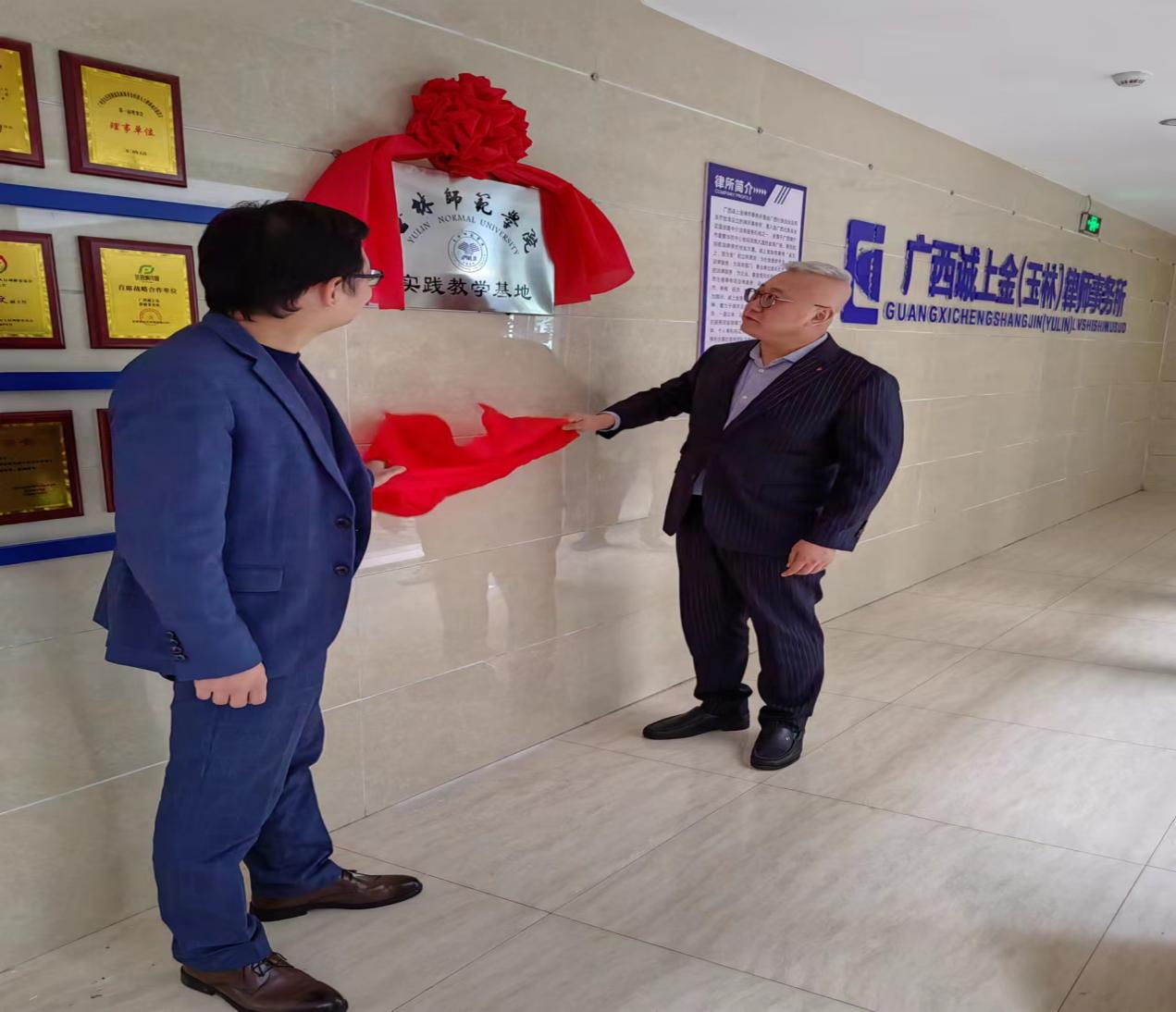 12月6日,政法学院院长周伟萌一行赴广西诚上金(玉林)律师事务所就“玉林师范学院教学实践基地”举行签约和挂牌仪式。仪式由广西诚上金(玉林)律师事务所主任王庆波主持。