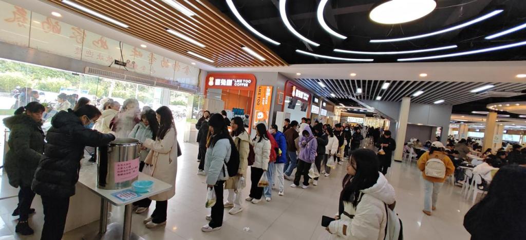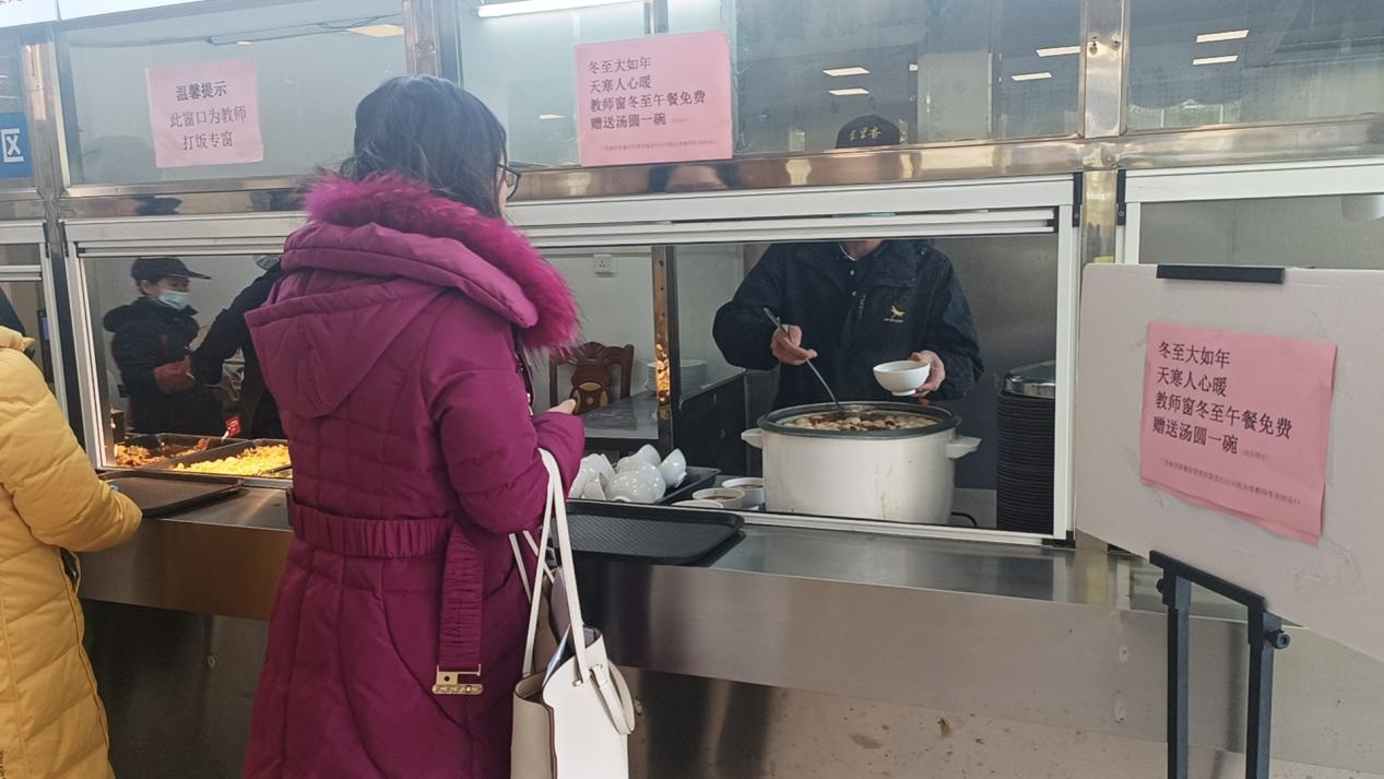 冒着热气的汤锅,白生生的汤圆和水饺在锅里滚动,食堂工作人员们将一碗碗热乎乎的汤圆和水饺分发给学生们,学生们的欢声笑语将冬日的寒冷驱散。甜蜜的汤圆和美味的水饺满足每一个人的肚子,融化在每一个人的心中。虽然学生们在冬至无法回家与亲人团聚,但是他们感受到学校食堂的关怀,让这个没有亲人陪伴的冬至多了一份温暖与温馨。