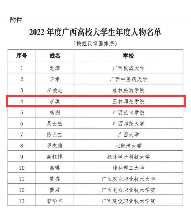 近日,由新华网广西频道、光明日报社广西记者站、广西高校易班发展研究中心、广西大学生在线联合组织开展2022年度广西高校大学生年度人物推选展示活动,经各高校申报、专家评审,并报广西壮族自治区党委教育工委同意,共遴选出2022年度广西高校大学生年度人物13名,我校物理与电信工程学院光电2019班李璞同学入选其中。