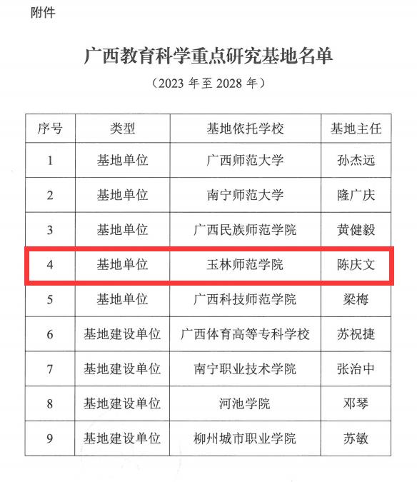 文件指出,为进一步提高广西高等教育科学研究水平,围绕广西教育发展战略,凝聚教育科学拔尖人才队伍,扶持广西教育原始创新研究成果,为教育决策咨询提供更好质量的服务,经专家评议并对申报候选基地进行实地考察和评估,最后公示批准设立5所广西教育科学重点研究基地单位,4所广西教育科学重点研究基地建设单位。我校成功入选广西教育科学重点研究基地单位中。