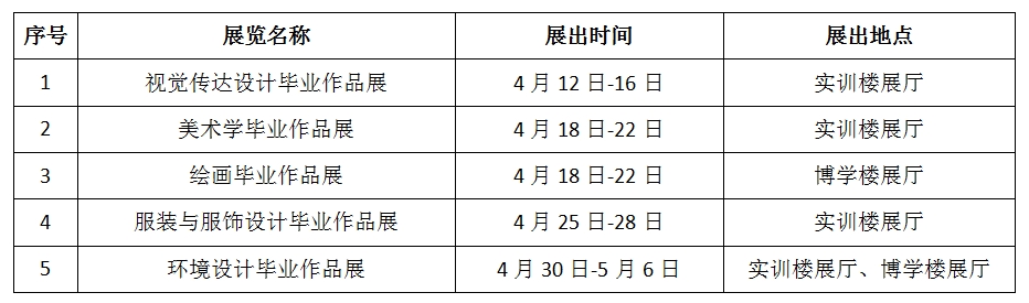 据悉,美术与设计学院2023届毕业作品展由视觉传达设计、美术学、绘画、服装与服饰设计和环境设计5个专业毕业展组成,分5期展出,具体安排如下: