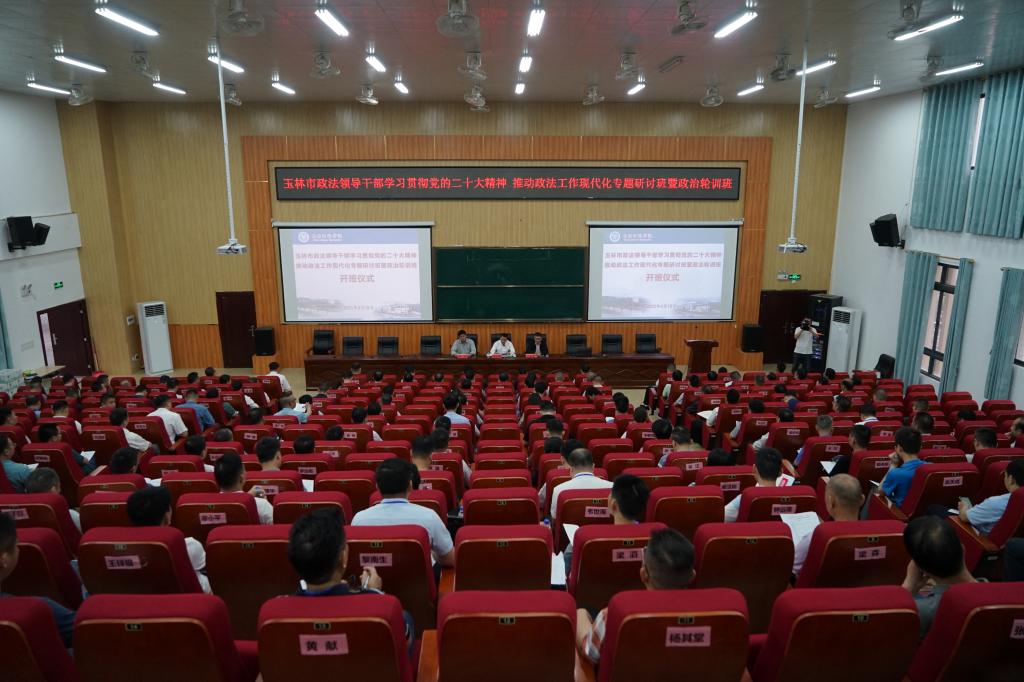 4月18日上午,玉林市政法领导干部学习贯彻党的二十大精神推动政法工作现代化专题研讨班暨政治轮训班在我校东校区开班。玉林市委常委、政法委书记黄宏瞻,学校副校长刘永建,物理与电信工程学院相关负责人以及培训班全体学员参加本次开班典礼。