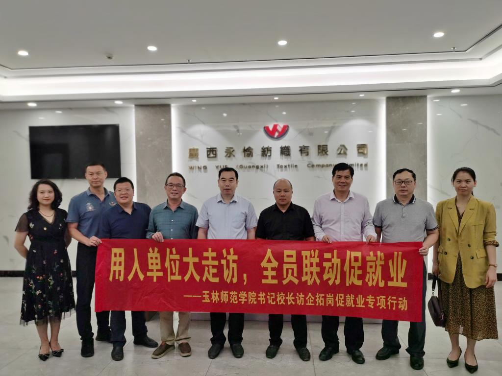 5月10日下午,党委副书记、校长李伟中带队赴福绵区玉林市新滔环保科技有限公司、广西永愉纺织有限公司开展“访企拓岗”促就业专项行动,与企业负责人面对面座谈交流。
