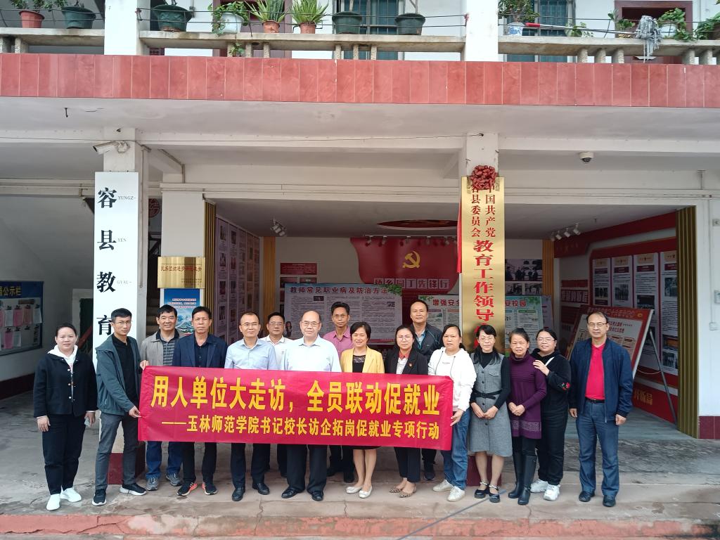 5月12日上午,学校党委常委、副校长黄映然带队赴容县开展走访校友活动暨“访企拓岗”促就业专项行动。容县县委常委、组织部部长陈瑞、容县教育局负责人和学校党委常委、组织部(统战部)部长庞国萍、生物与制药学院、后勤基建处、公共体育教学部负责人参加调研。