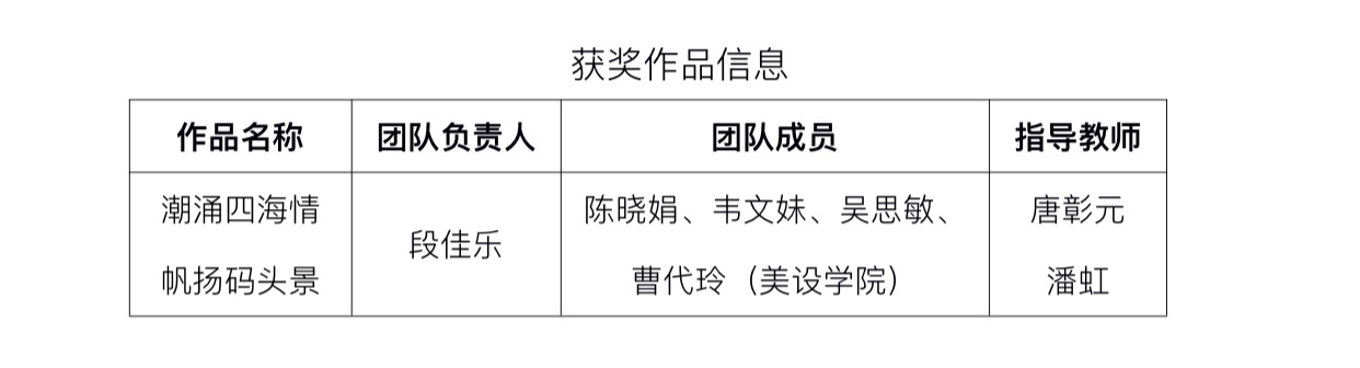我校作品《潮涌四海情 帆扬码头景》紧扣主题,深挖老码头海浪、驳船等标志性文化符号,设计成冲浪板、潜水服、徽章、拼图、邮票、雨伞等系列文创产品,坚持创新和发展,成功入围决赛,与海南大学、西安外国语大学、桂林理工大学、福建师范大学等高校代表队同台竞技。在决赛中,我校学子表现出高超的专业水准和强大的心理素质,圆满完成现场答辩和作品展示两个环节,最终获得“文创视觉类产品设计”赛道第四名的好成绩,荣获全国二等奖。