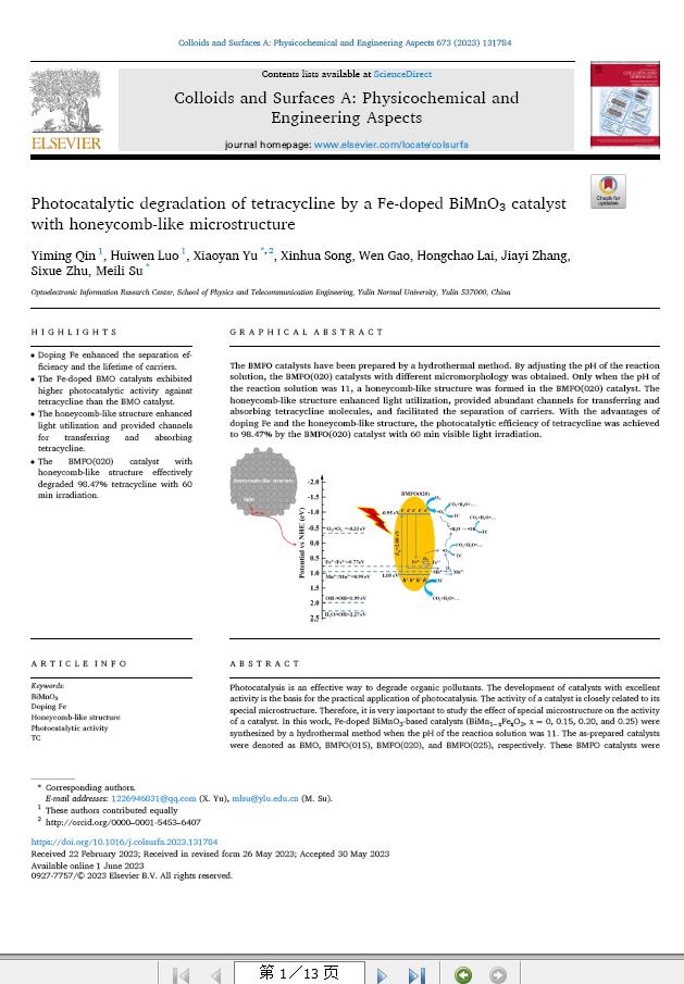 近日,以我校物理与电信工程学院光电信息科学与工程专业2019级学生秦一鸣、2020级学生罗惠文为共同第一作者,教师余小燕为通讯作者的研究论文“Photocatalytic degradation of tetracycline by a Fe-doped BiMnO3 catalyst with honeycomb-like microstructure”在SCI二区期刊《Colloids and Surfaces A: Physicochemical and Engineering Aspects》(影响因子:5.518)上发表。