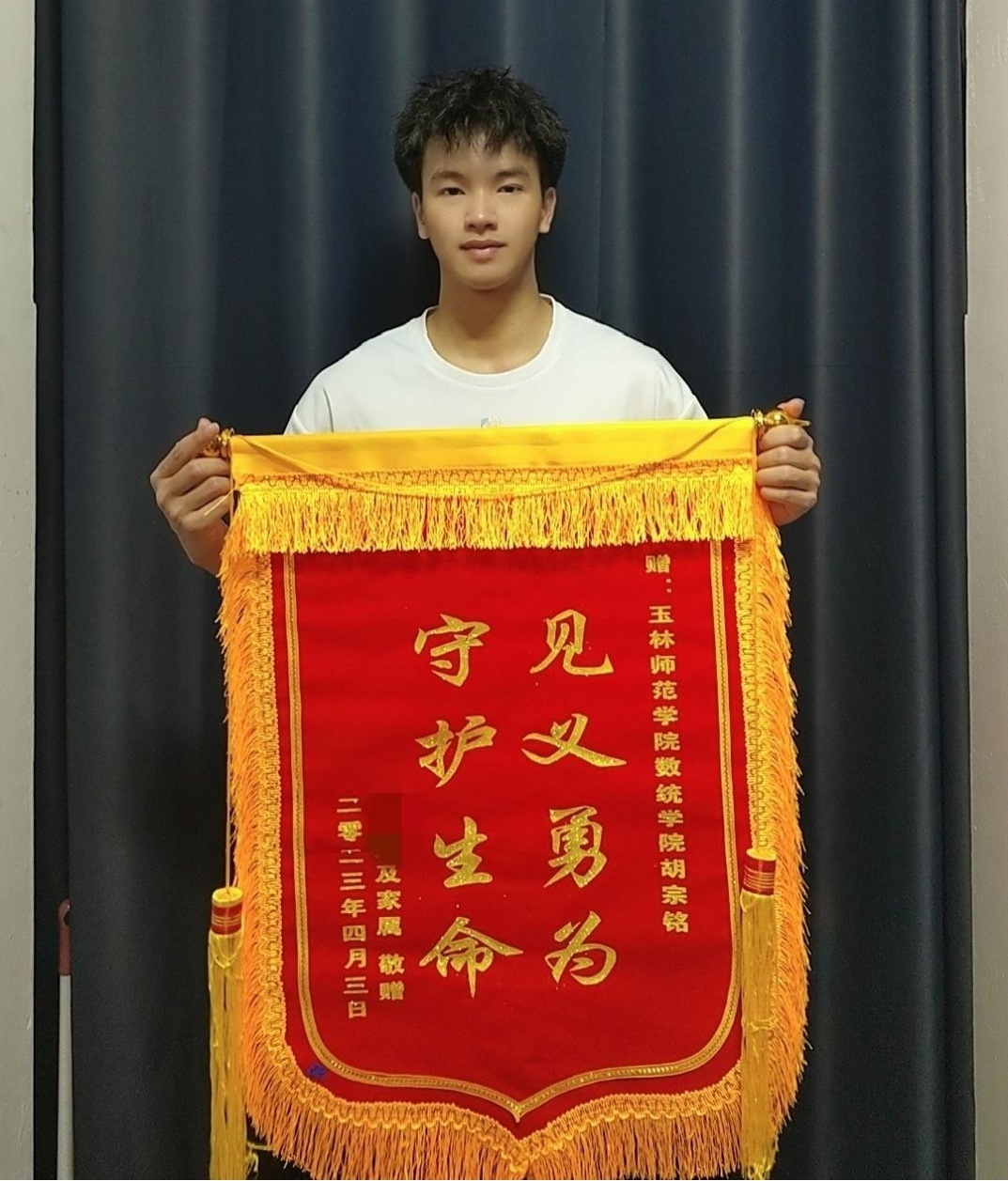 “因为自己淋过雨,所以总想替别人撑把伞”。近日,玉林师范学院数学与统计学院胡宗铭同学“见义勇为,守护生命”的感人事迹在该校师生中产生广泛的辐射影响,事件起因于两名学生及亲属为他敬赠了一面锦旗……