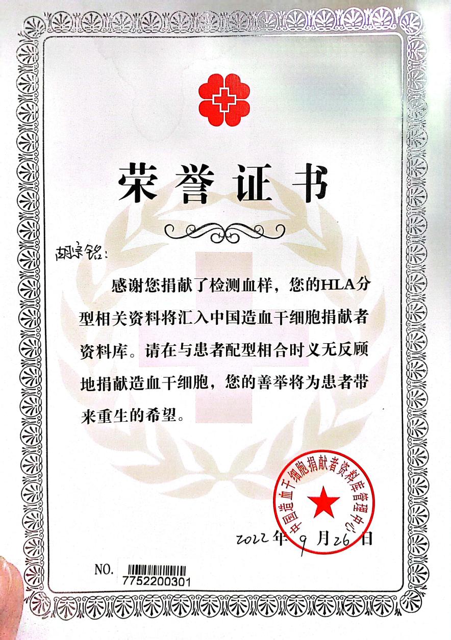 鲁迅先生曾说:“有一份热,发一份光”。见义勇为不分年龄,播撒善意时刻铭记,最脆弱的躯体,都藏着最伟大的灵魂。记者了解到,大学入学后,胡宗铭偶然得知两位学姐的家人突发重大疾病(一位身患血管瘤、一位身患膀胱癌),急需输血治疗,他主动联系学生,先后为患者进行定向输血800毫升,捐献血小板和白细胞,同时登记个人骨髓入库,帮助受助对象咨询相关病情的治疗方案,以及手术费用报销的相关政策。