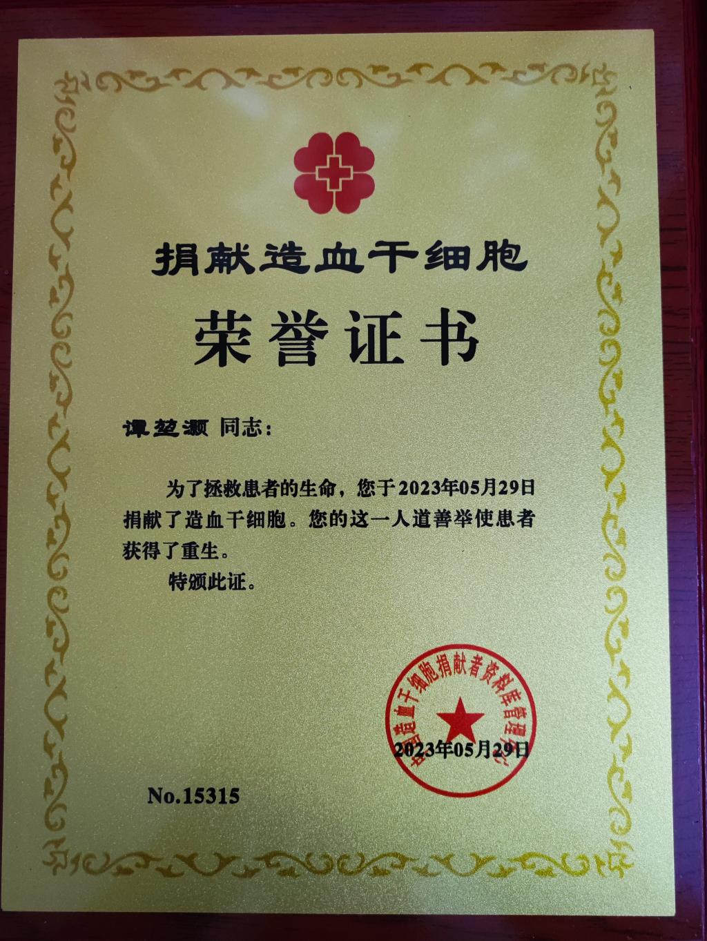——造血干细胞捐献者教育科学学院2017级毕业生谭堃灏