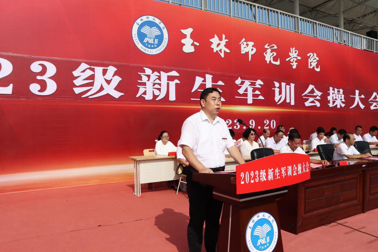 校长李伟中做军训总结讲话。学校党委书记李清先,玉林军分区战备建设处上校处长马亮,学校党委常委、副校长石维有出席大会。