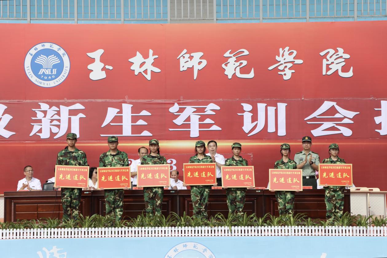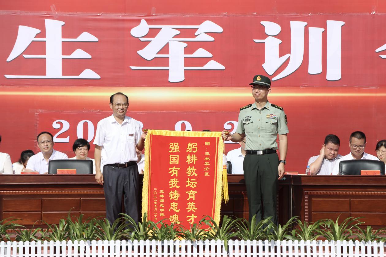 李清先向承训单位玉林军分区赠送锦旗,并宣读表彰“军训工作先进单位”“优秀连队”“优秀教官”“优秀标兵”的决定。现场以热烈的掌声向获得表彰的连队和个人表示祝贺。