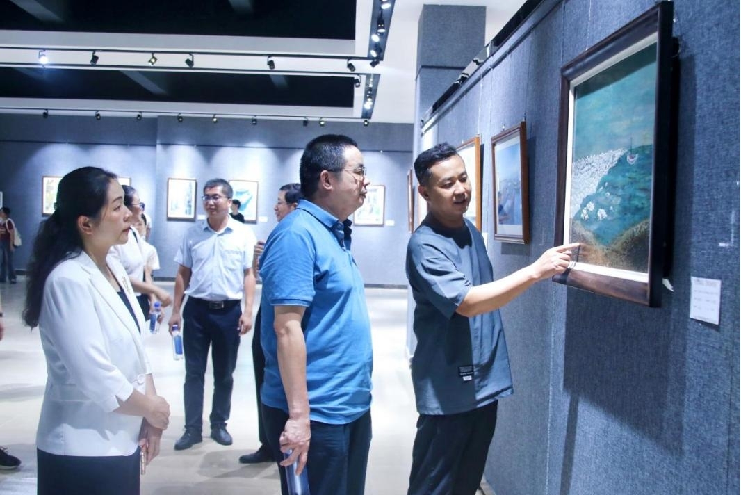 韦广雄宣布第二届“书香玉师·美育经典”活动开幕,参会人员到美术与设计学院展厅参观展览。展出作品用色彩、笔墨表现艺术之美,全面呈现了大学生探索自我、感悟人生、体察时代的艺术面貌,与时代同向,与祖国同行,胸怀家国、奋力筑梦的价值追求。
