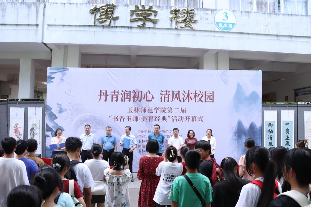 为大力弘扬中华优秀传统文化,打造书香校园,促进大学生审美素养,充分展示校园文化建设和艺术教育成果,9月22日下午,学校在东校区举办“丹青润初心,清风沐校园”第二届“书香玉师·美育经典”活动。学校党委副书记韦广雄,学校党委常委、宣传部部长徐一周出席活动开幕式,图书馆、教务处、校团委、美术与设计学院、音乐舞蹈学院部门负责人,玉林市书法家协会和美术家协会代表,各二级学院师生代表参加开幕式。