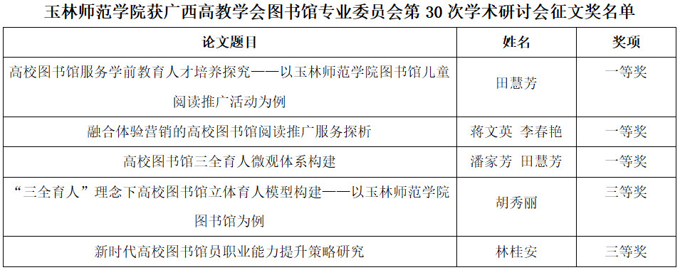 近日,广西高教学会图书馆专业委员会第30次学术研讨会征文论文经论文重合度检测、规范性审查和专家评审,评出特等奖4篇、一等奖10篇、二等奖20篇、三等奖40篇。其中,我校教师获一等奖论文3篇、三等奖论文2篇。